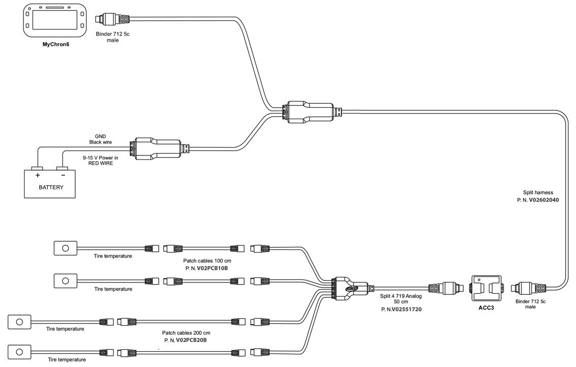 ACC3, split harness, split 4 719 Analog 50 cm, two patch cables 4M719-4F719 100 cm, two patch cables 4M719-4F719 200 cm, four tire temperature sensors.